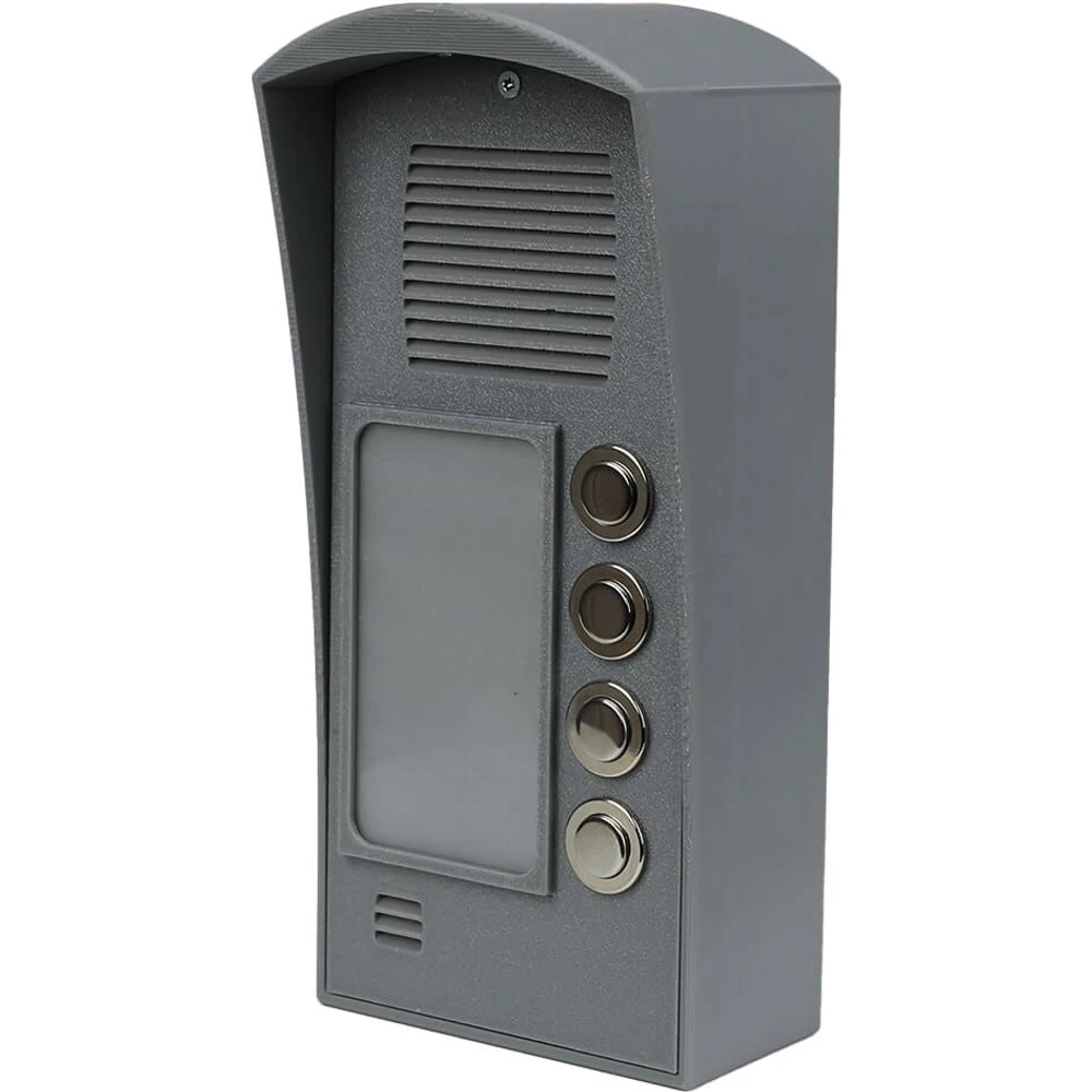Az InterCom 4G Kit 4 lakásos falonkívüli egysége, négy fém nyomógombbal van szerelve, melyhez maximum 8 értesítendő telefonszámot adhatunk meg. A telefonszámokat lehet körhívással is hívni, azaz mindenkinek fel kell vennie vagy az első személy aki felveszi, megállítja a körhívást.